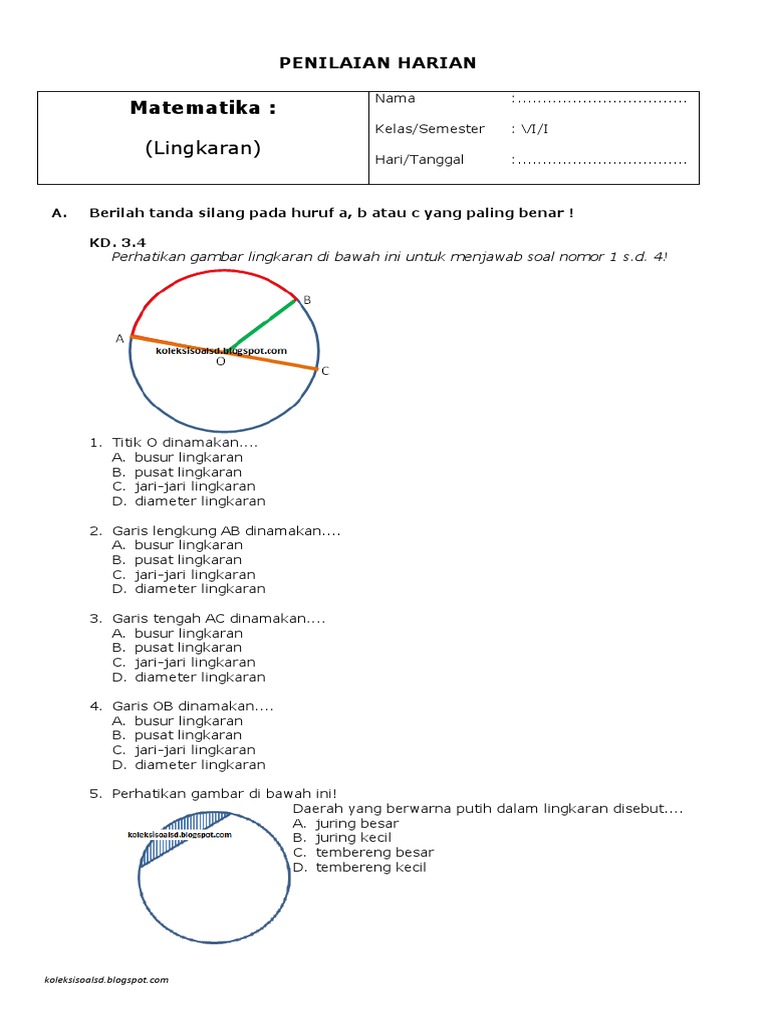 Soal Penilaian Harian Matematika Kelas 6 Semester 1 Lingkaran